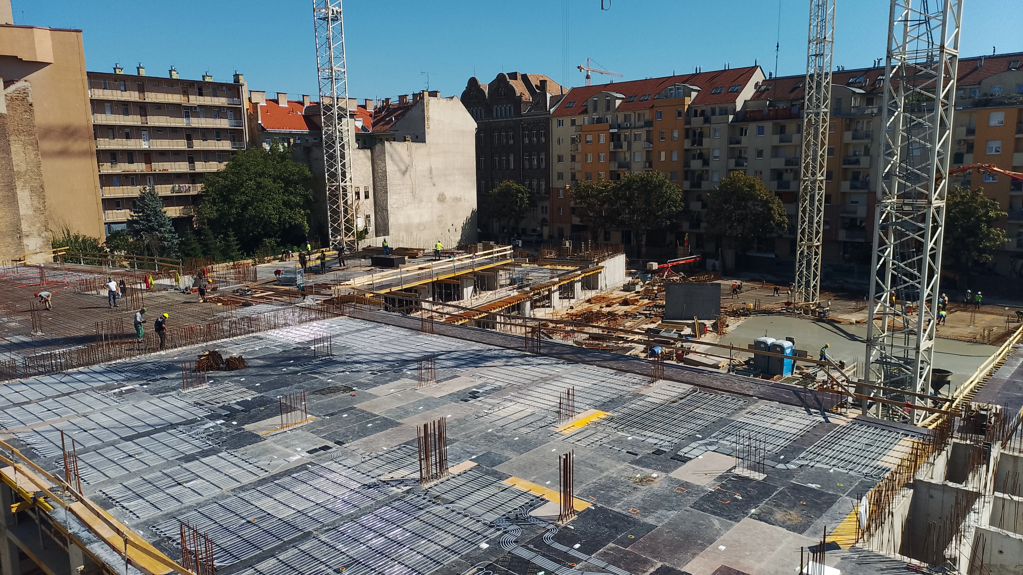 A "C" és "D" épület 1 emeleti függőleges szerkezetei elkészültek, a C épület 2. szintjének zsaluzata összeállt, a villamos és paneles kivitelezők már itt is végeztek a szükséges installációkkal, megkezdődött a vasszerelés.